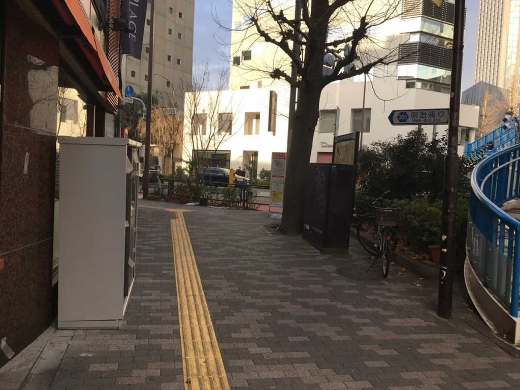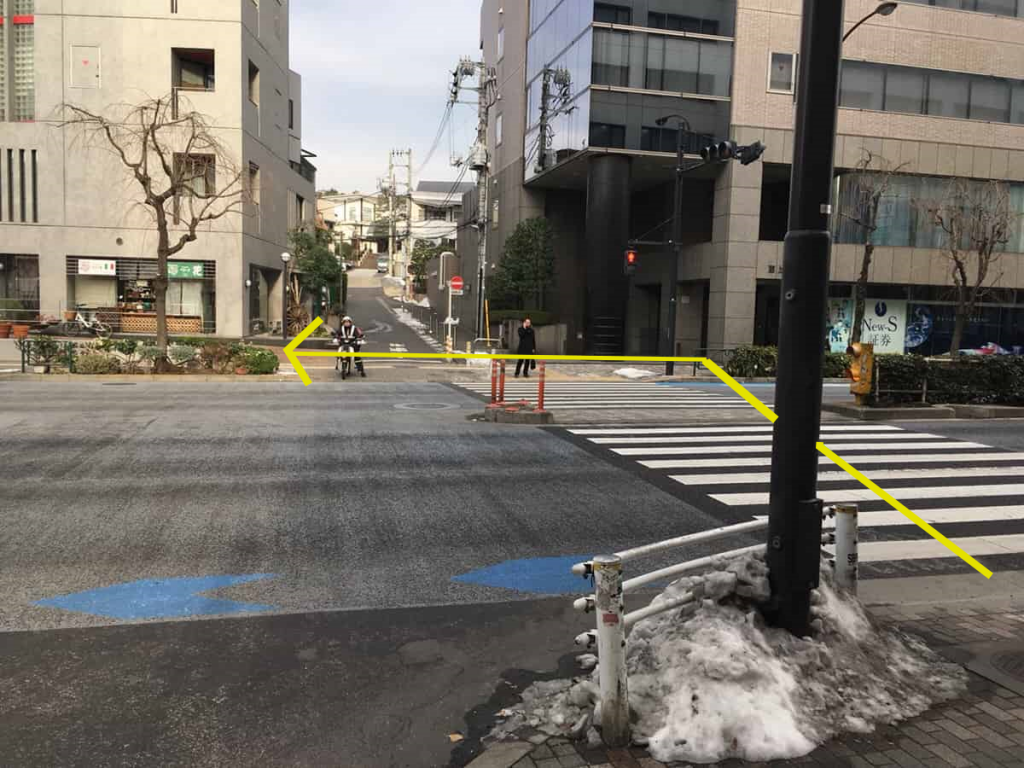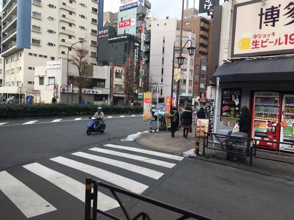 十字路を渡ってしばらく直進すると、明治通りと交差するT字路にでます。そのT字路を左折し、今度は明治通り沿いに直進します。