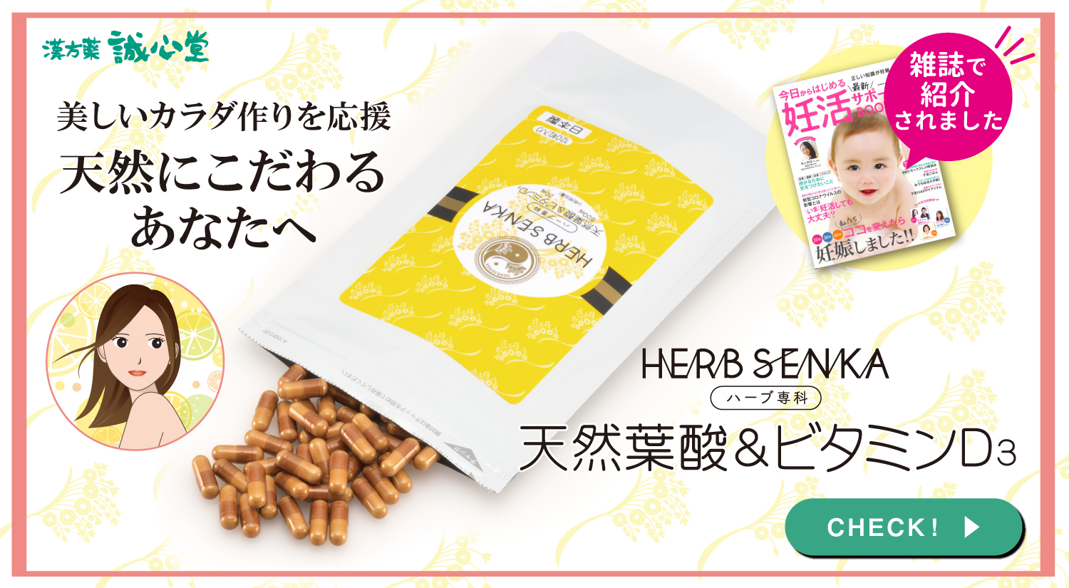 妊活相談33年の実績を持つ誠心堂薬局が新たに開発したのがこのハーブ専科。市販のサプリメントでは人工的に合成されたものがほとんどである中、農薬を使用せずに栽培されたレモン果皮由来100%の「葉酸」と羊毛由来のビタミンD₃を組み合わせて作られたという、天然志向の方におすすめしたいサプリメントです。1日量で天然葉酸 800μg、ビタミンD₃20μgを摂取することが出来ます。妊活に必要な栄養素として今注目され始めている、ビタミンD₃も豊富に含んでいるのも特徴の一つです。