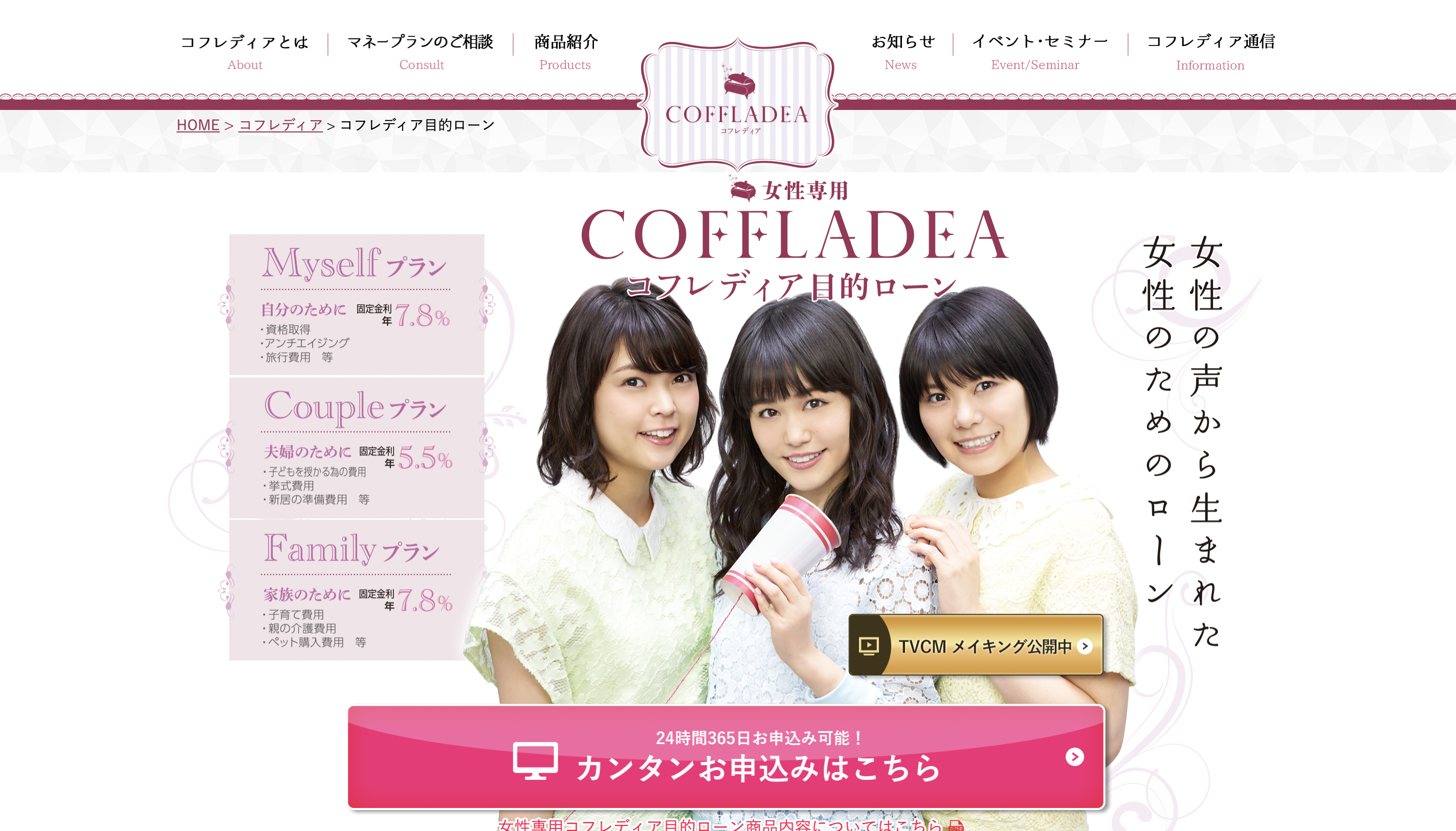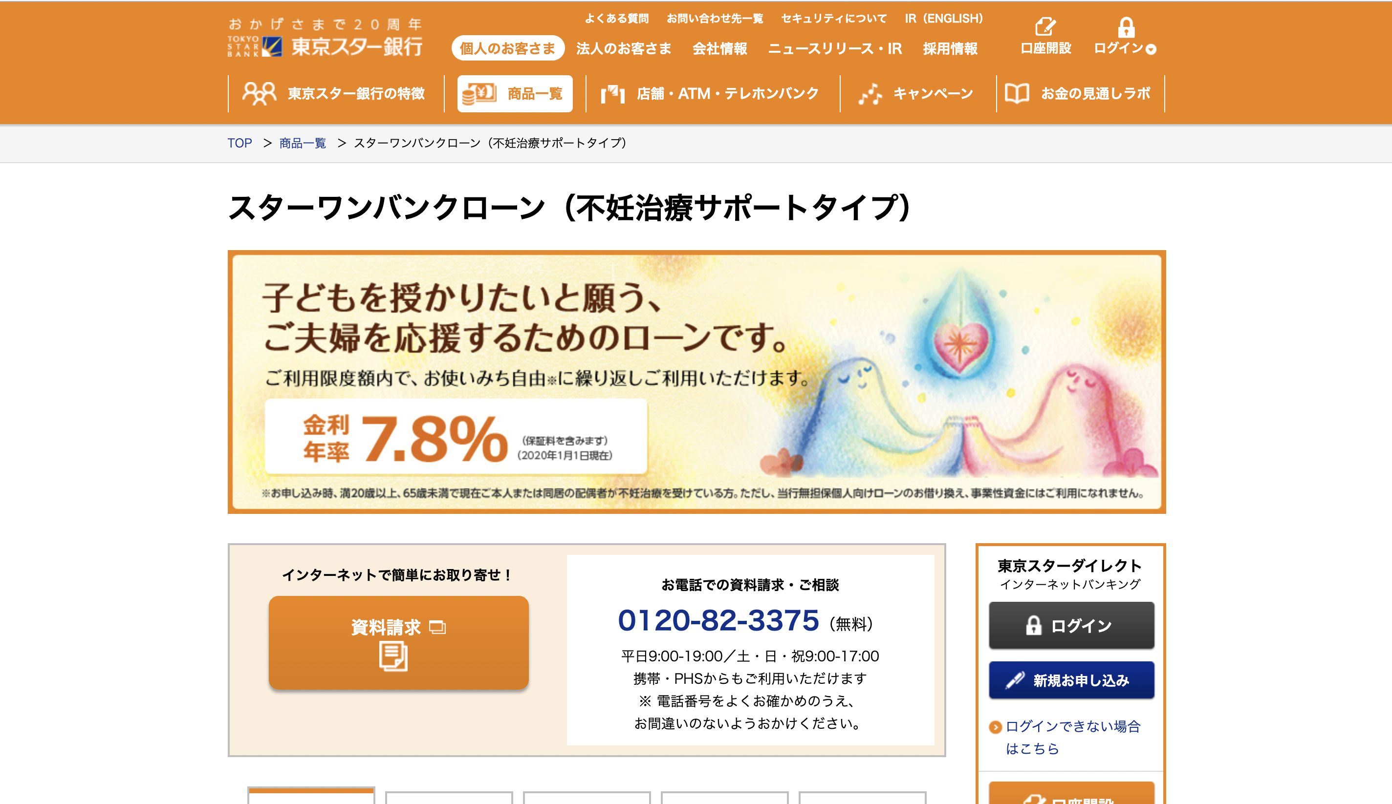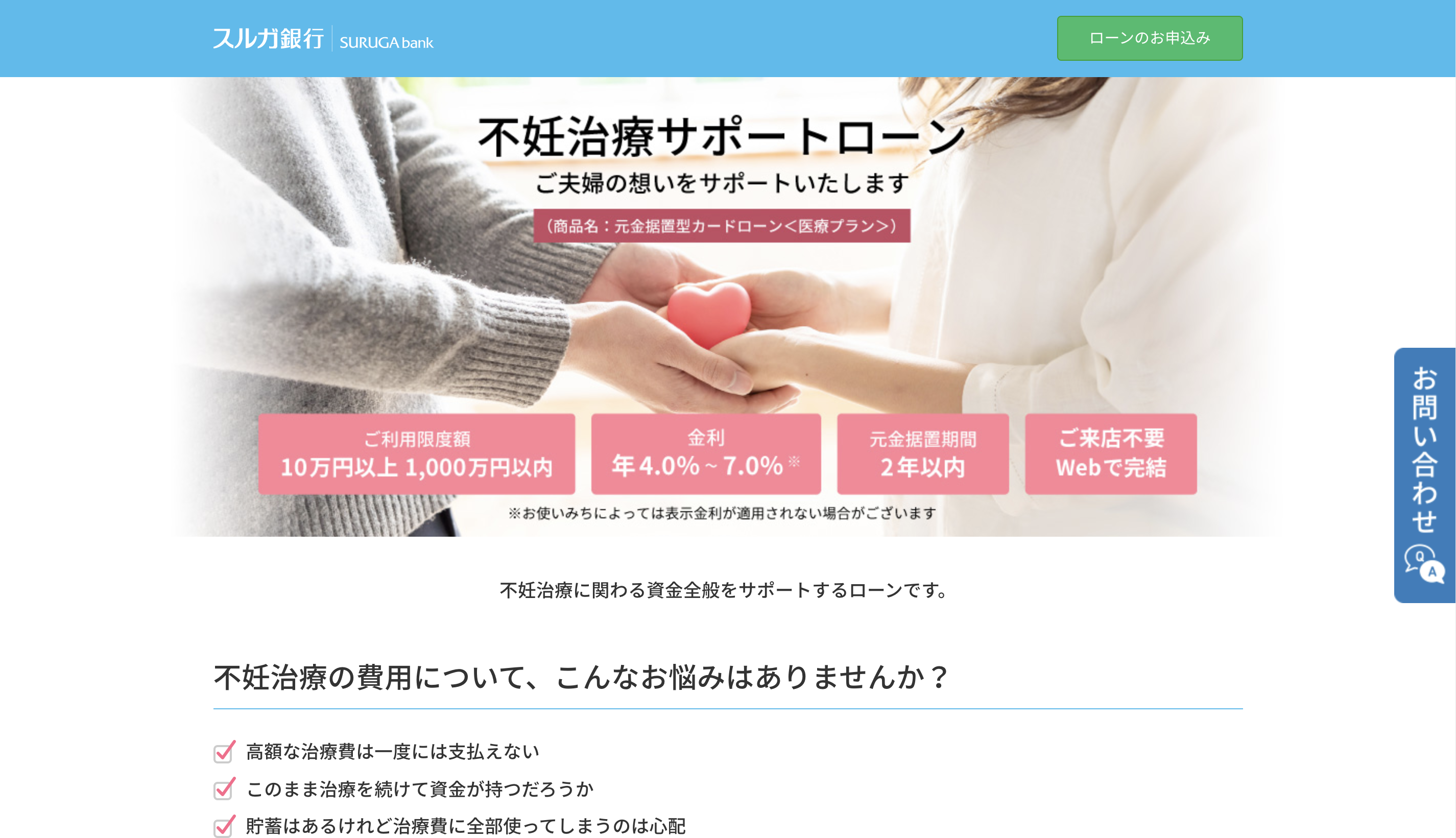 - 特徴:Web上で24時間365日申し込みが可能 借入金額300万円までは所得証明書は原則不要 3つのコース、9つのプランから選択可能(不妊治療の場合は、「夫婦のためのCoupleコース」)