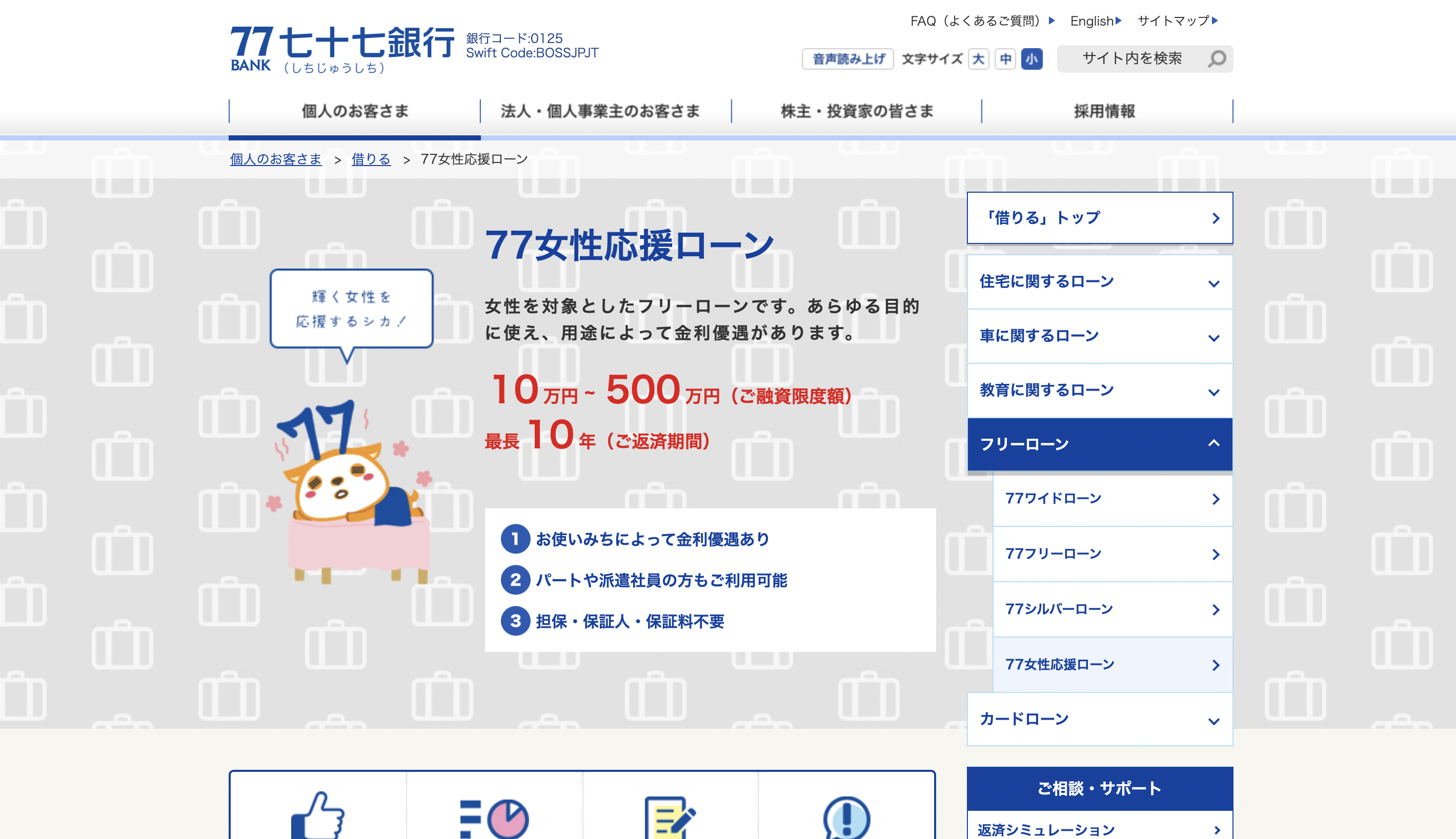 - デメリット:営業エリアである宮城県を中心とした東北エリアに申込みを限定(東京支店での申込みはできない)している。基本的には七十七銀行の口座を開設し、給料の振込などその口座を使用している状態からのみ、申込みが可能(七十七銀行の利用者がサービスの対象)。