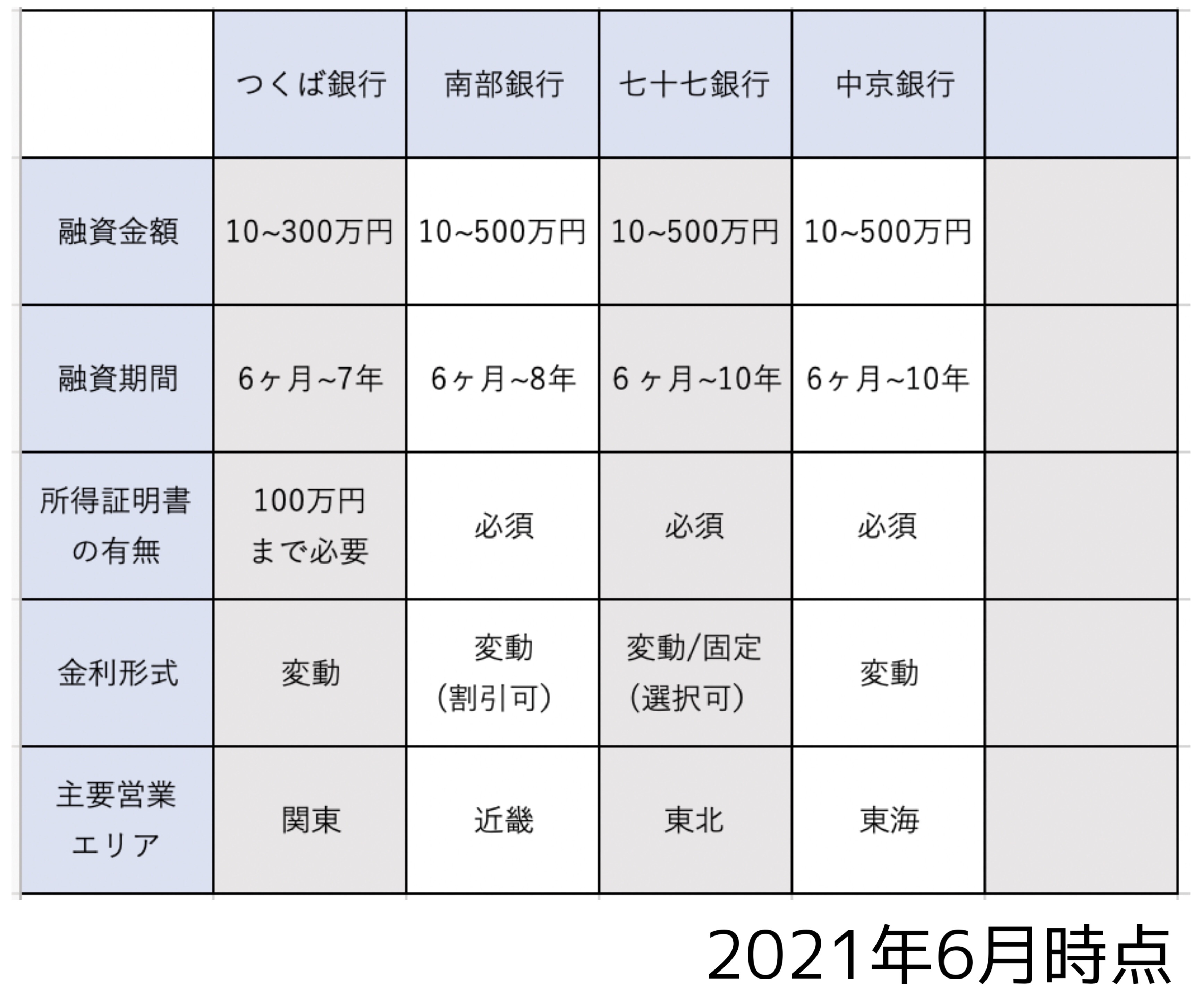 以下に、融資金額、融資の期間や必要な書類などについて、一覧でまとめています。 是非、参考にしてください。