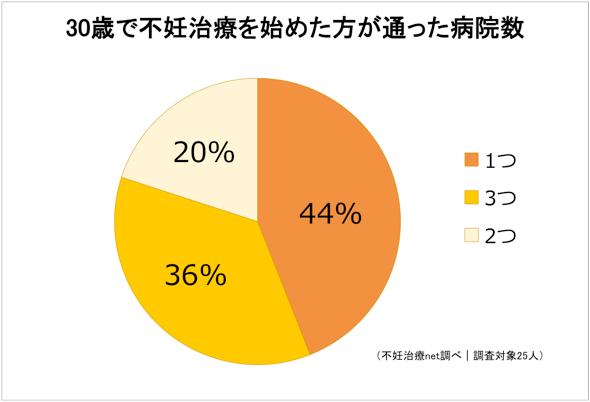 30歳で不妊治療を始めた方が通った病院数は1つが一番多くなっています。30歳というと比較的若い年齢なので、最初に通った病院で妊娠できることも多いのかもしれません。また、3つの病院に通ったという方も多く、「30歳で不妊治療を始めても、妊娠をすることがなかったので新しい病院に変えた」、「4年不妊治療をしていたが、妊娠に至らなかったのであわてて病院を変えた」などの声がありました。1つの病院で妊娠しなかった場合、おもいきって病院を変えるのも良いのかもしれません。