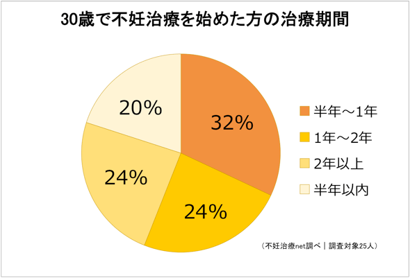 このデータによると30歳で不妊治療を始めた方の8割は半年以上不妊治療を続けているということになります。「30歳から不妊治療を始めたが、すぐに妊娠に至った」、「初めて通院してから半年で妊娠することができた」などのコメントがあり、一概には言うことはできませんが、妊娠するまでには半年以上はかかるということを考慮しておくと良いかもしれません。