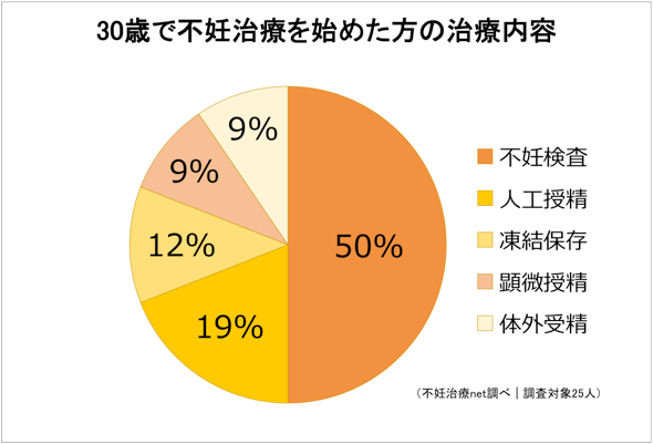 年齢に関係なく、不妊治療を始める方は不妊検査を受けることが多いようです。30歳は比較的若いとされていて、タイミング法で様子をみることが多いといいます。人工授精や体外受精の比率が低いのは30歳に対する治療法が影響しているのかもしれません。